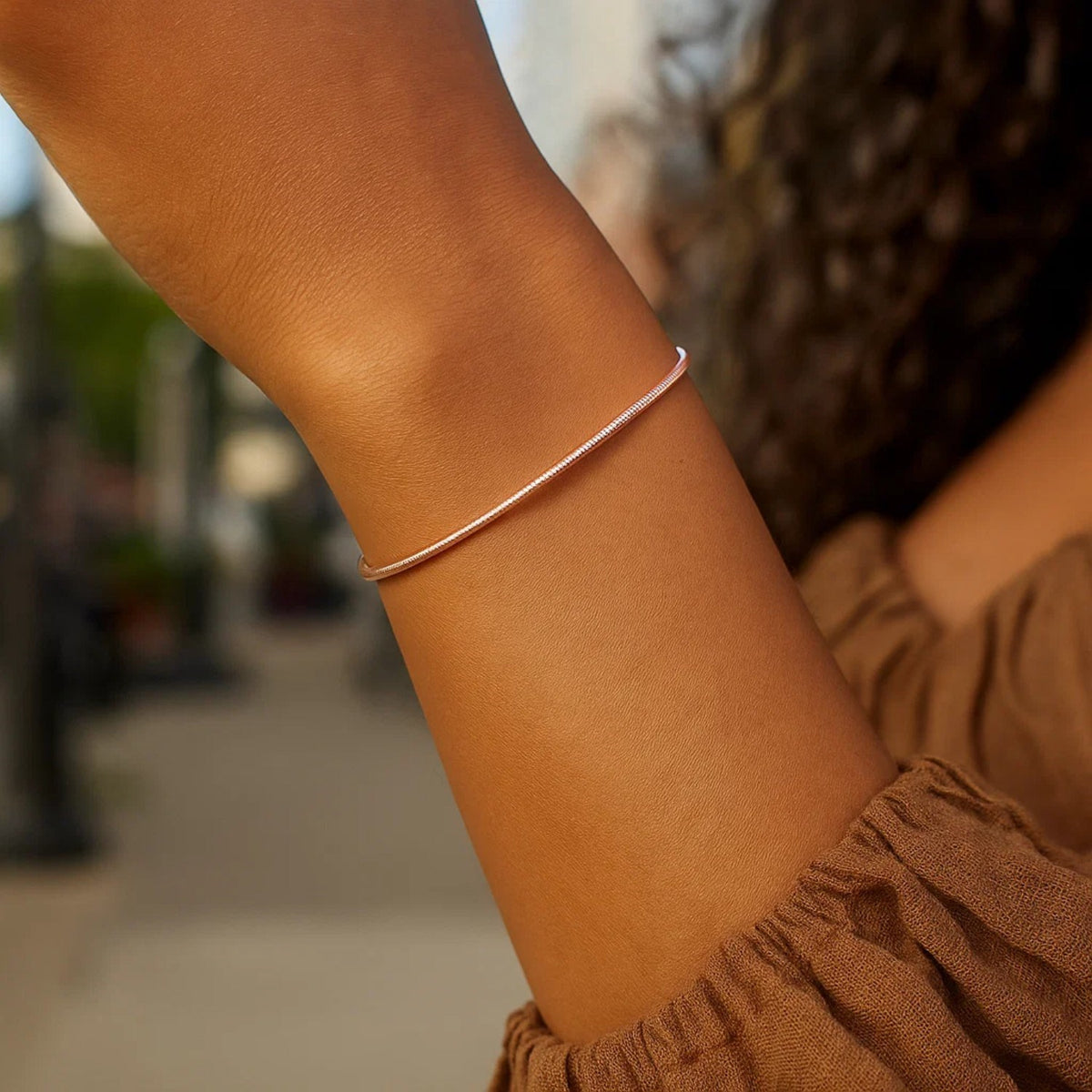 Crafted in 14K rose gold, this elegant 7 inches diamond cut stack bangle bracelet adds brilliance and texture to any look. Designed with a pear shaped lobster clasp for secure wear, it’s perfect for stacking or as a standalone statement piece.