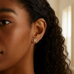 Stylish 14K yellow gold “Yours Truly” Initial R stud earrings featuring a polished finish and sleek minimalist design. These personalized earrings add a touch of elegance and individuality, perfect for daily wear or as a meaningful, timeless gift.