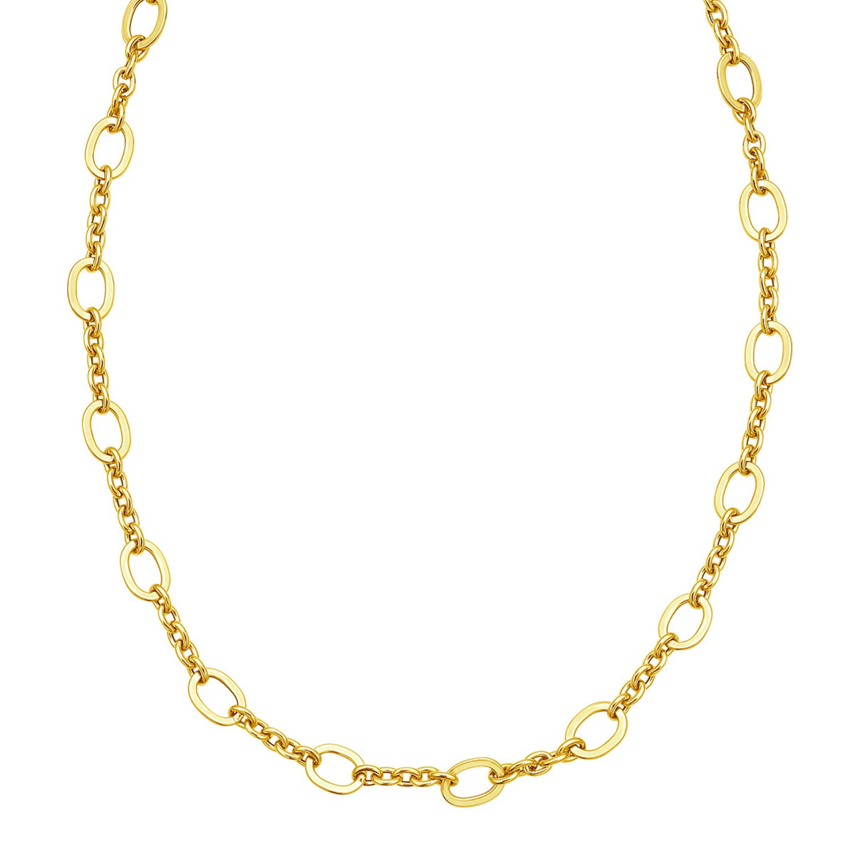 Elevate your style with our 14K Yellow Gold Five and One Oval Link Chain. This exquisite piece features a unique pattern of five polished round links followed by a single oval link, creating a sophisticated and eye-catching design. Crafted from high-quality 14K yellow gold, it offers a luxurious shine that complements any ensemble. Available in 18 inches length secured with a reliable lobster clasp, ensuring comfort and durability for daily wear or special occasions. Enhance your jewelry collection with this timeless and versatile accessory.