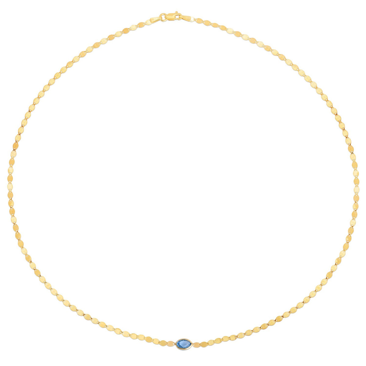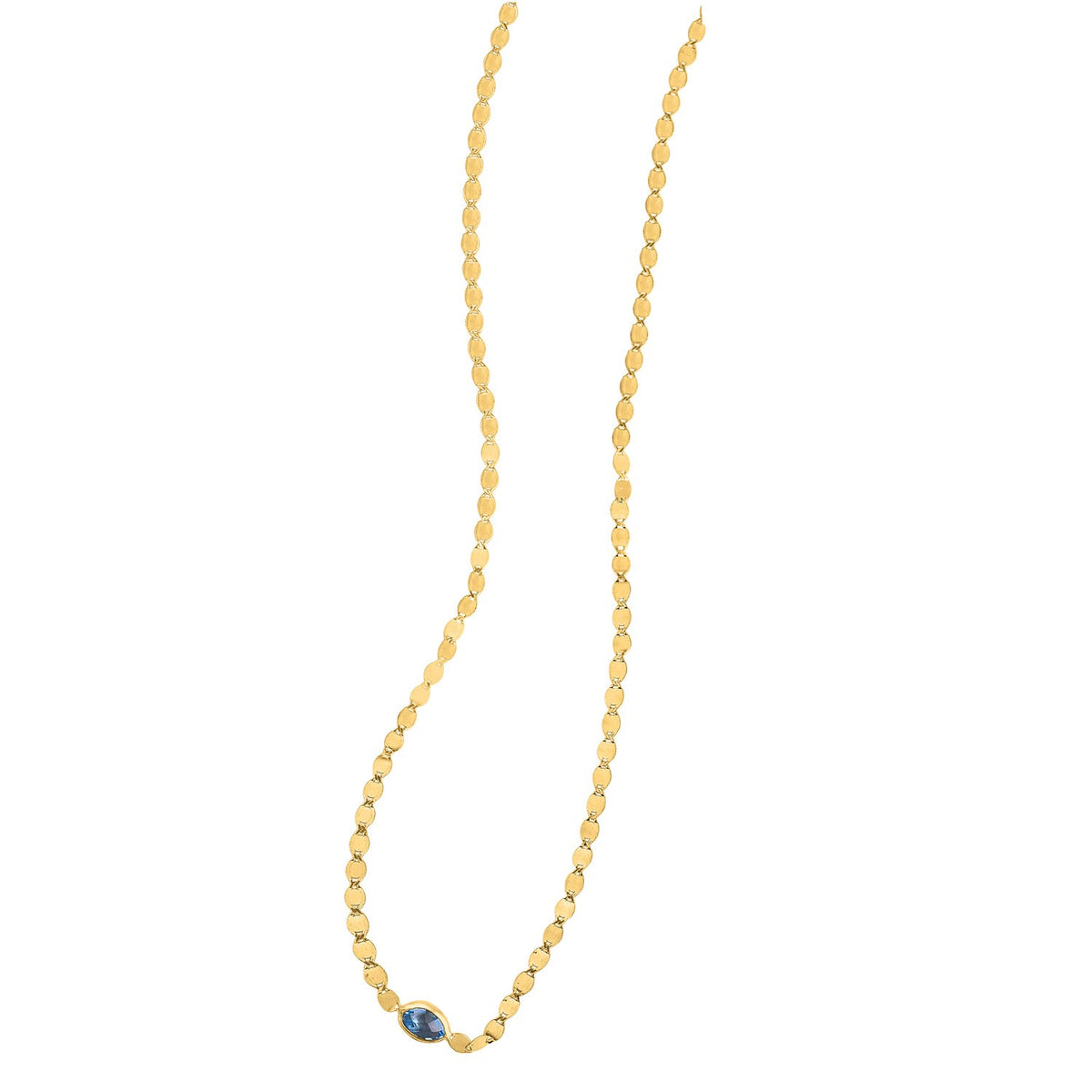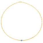 Crafted in lustrous 14K yellow gold, this elegant mirrored chain features a vivid 6×40 mm oval Blue Topaz center, adding a touch of regal color. The sleek 2.20 mm mirrored chain beautifully reflects light, creating a subtle shimmer with every movement. Measuring 16 inches in length and finished with a secure lobster clasp, this piece merges timeless craftsmanship with wearable glamour.
