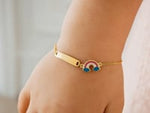 This Rainbow Childrens bar bracelet is beautifully crafted in 14k yellow gold with a high polish finish and closes with a spring ring clasp. With a dainty rainbow charm & a blank tag that can be engraved you will love this bracelet. Measures 5 1/2 inches in length.