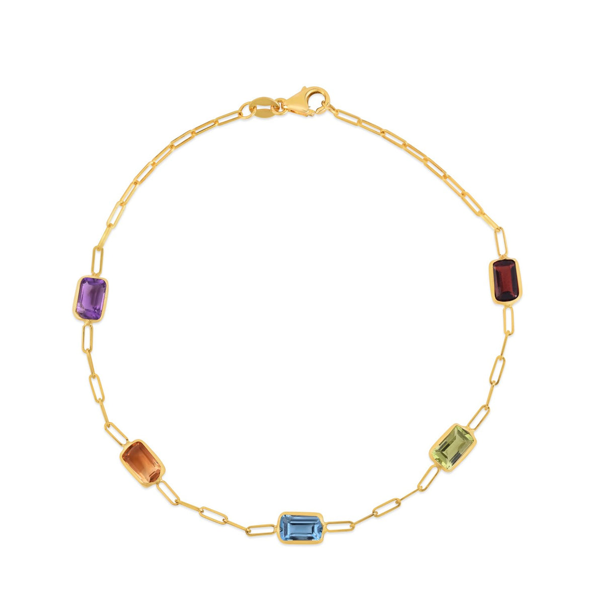Crafted in solid 14K yellow gold, this elegant paperclip chain bracelet showcases a vibrant lineup of baguette cut gemstones garnet, peridot, blue topaz, citrine, and amethyst bringing a lively pop of color to a timeless design. Measuring 7 inches in length, it is finished with a secure lobster clasp, making it perfect for everyday wear or special occasions.