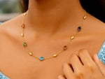 Introducing our 14K Yellow Gold Oval Gemstone and Bead Necklace, a harmonious blend of elegance and vibrant color. This 17 inches necklace showcases polished oval gemstones—including amethyst, blue topaz, garnet, peridot, and citrine—interspersed with delicate gold beads. Secured with a reliable lobster clasp, this piece adds a touch of sophistication to any ensemble, making it a versatile addition to your jewelry collection.