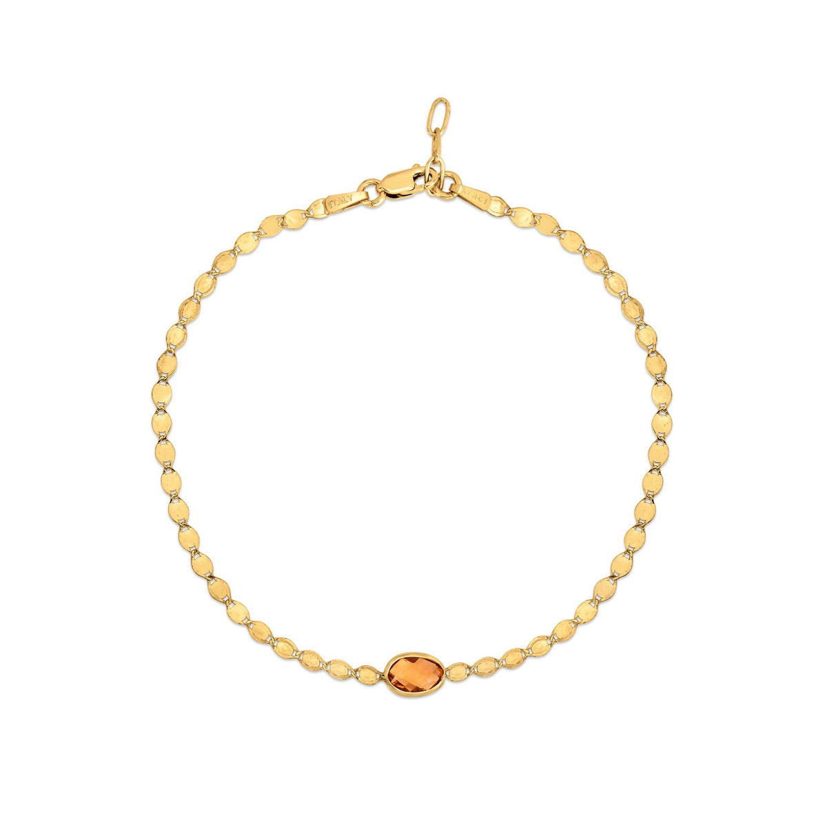 Crafted in lustrous 14K yellow gold, this elegant mirrored chain bracelet features a vivid 6×40 mm oval Citrine center, adding a touch of regal color. The sleek 2.20 mm mirrored chain beautifully reflects light, creating a subtle shimmer with every movement. Measuring 7 1/4 inches in length and finished with a secure lobster clasp, this piece merges timeless craftsmanship with wearable glamour.