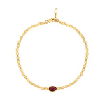 Crafted in lustrous 14K yellow gold, this elegant mirrored chain bracelet features a vivid 6×40 mm oval Garnet center, adding a touch of regal color. The sleek 2.20 mm mirrored chain beautifully reflects light, creating a subtle shimmer with every movement. Measuring 7 1/4 inches in length and finished with a secure lobster clasp, this piece merges timeless craftsmanship with wearable glamour.