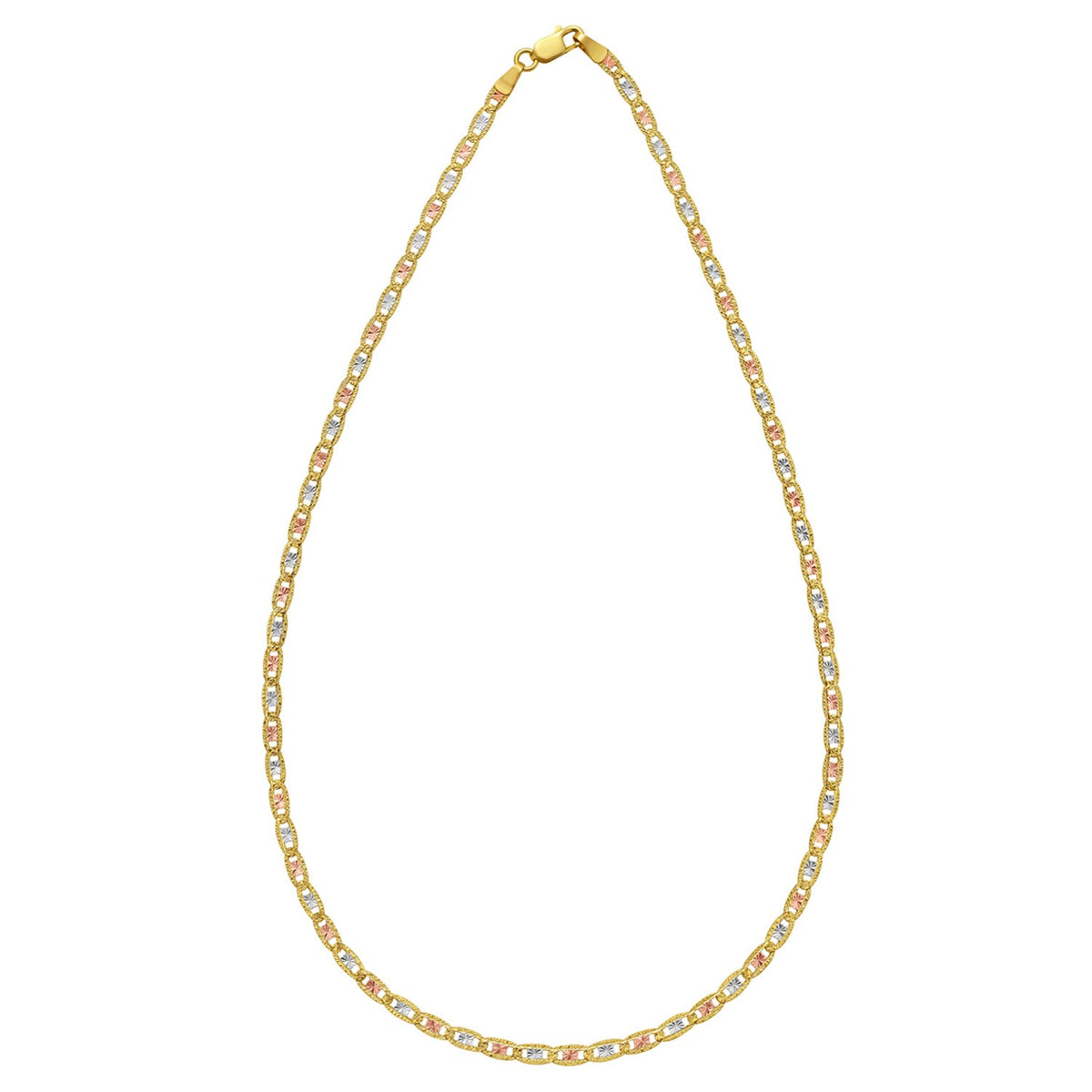 Discover timeless elegance with this 14K Tri Color Gold Pave Valentino Chain, featuring a sleek 3.00 mm width and signature Valentino-style links with subtle pave detailing. Crafted for durability and style, it’s secured with a reliable lobster clasp and available in three popular lengths 16 inches, 18 inches, and 20 inches. Perfect for everyday wear, layering, or pairing with your favorite pendant, this fine gold chain adds a luxurious touch to any outfit.