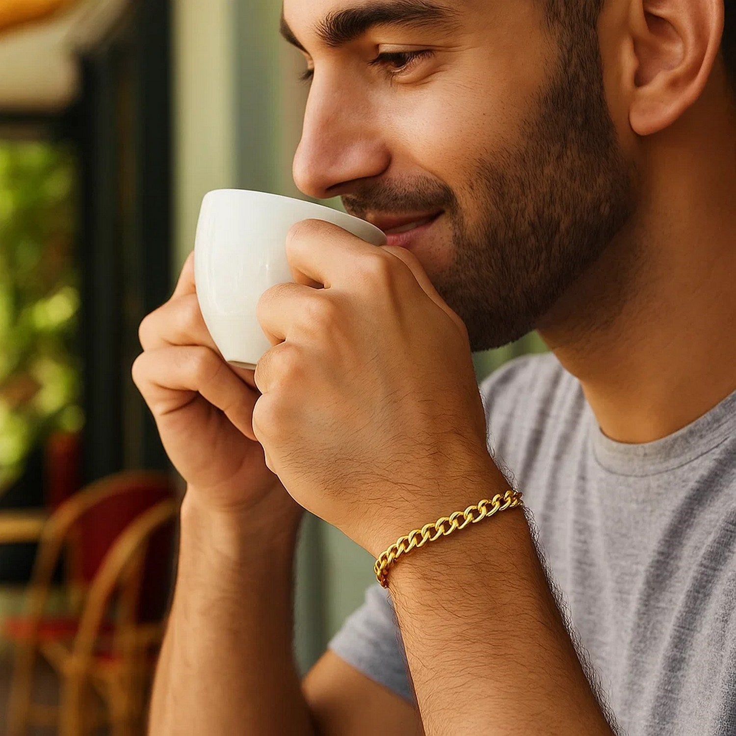 This lite curb bracelet comes in 14k yellow gold and has a width of 6.2 millimeters. Secured with a lobster clasp.