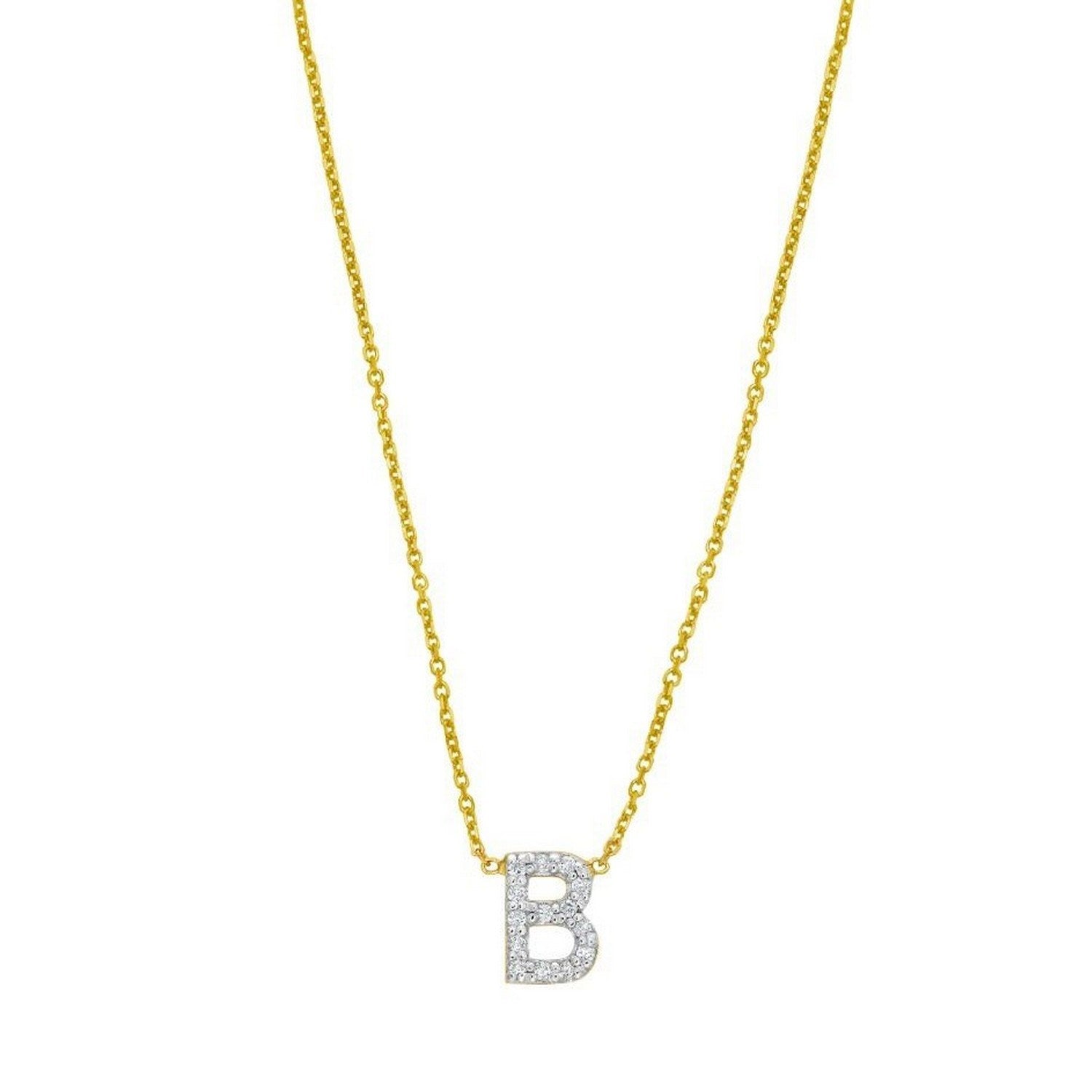 Celebrate individuality with this 14K yellow gold mini diamond B initial pendant. Adorned with sparkling round diamonds, this dainty yet elegant piece adds a personal touch to any look. Perfect for everyday wear or as a thoughtful gift, it comes with an 18 inches chain and a secure spring ring clasp for lasting beauty and comfort.