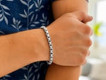 Rhodium plated round box bracelet crafted in sterling silver measuring 5.2 millimeters in width. Bracelet is 8 1/2 inches long and closes with a lobster clasp.