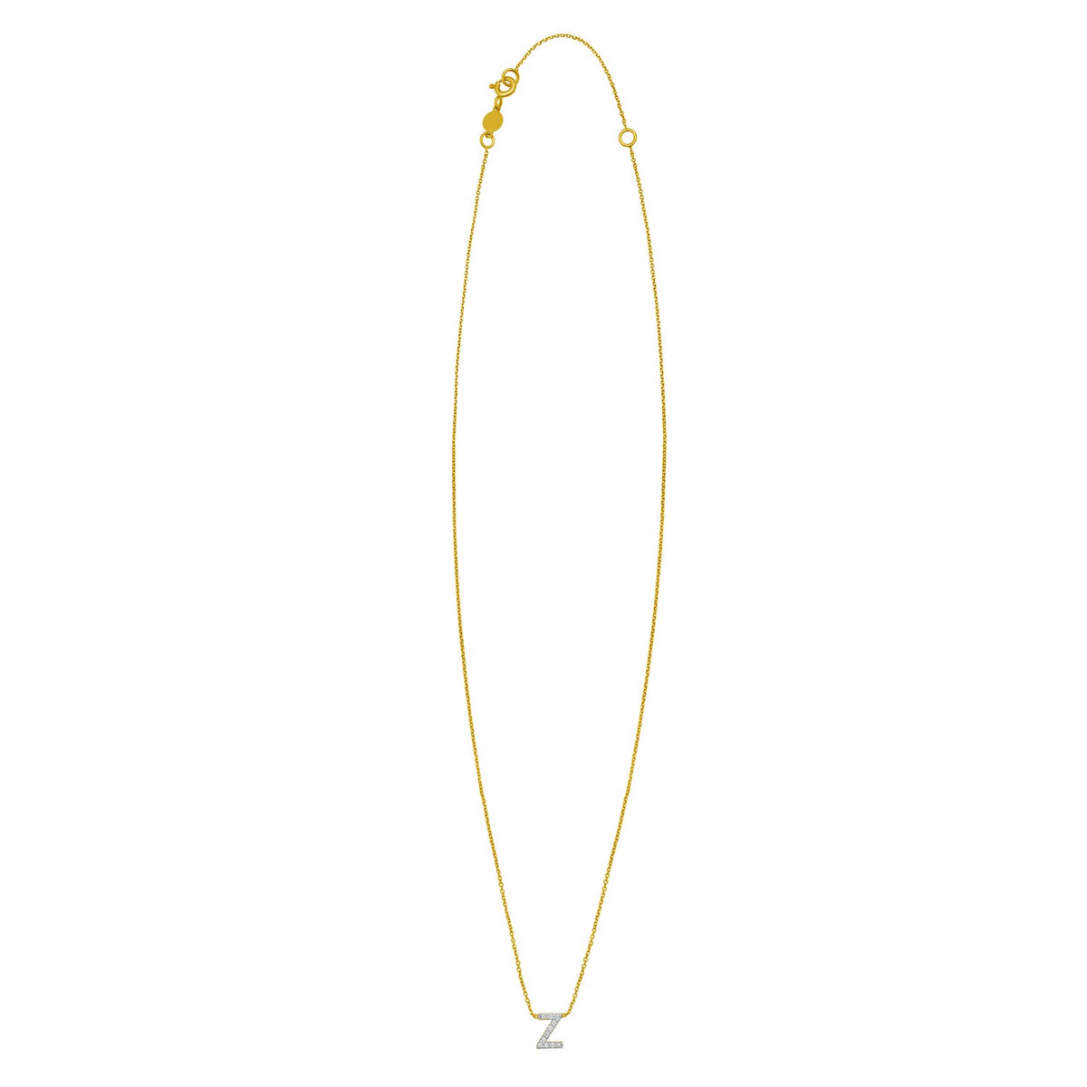 Celebrate individuality with this 14K yellow gold mini diamond Z initial pendant. Adorned with sparkling round diamonds, this dainty yet elegant piece adds a personal touch to any look. Perfect for everyday wear or as a thoughtful gift, it comes with an 18 inches chain and a secure spring ring clasp for lasting beauty and comfort.